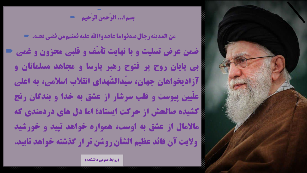 ضمن عرض تسلیت و با نهایت تأسّف و قلبی محزون و غمی بی پایان روح پر فتوح رهبر پارسا و مجاهد مسلمانان و آزادیخواهان جهان، سیّدالشّهدای انقلاب اسلامی، به اعلی علّیین پیوست و قلب سرشار از عشق به خدا و بندگان رنج کشیده صالحش از حرکت ایستاد؛ اما دل های دردمندی که مالامال از عشق به اوست، همواره خواهد تپید و خورشید ولایت آن قائد عظیم الشأن روشن تر از گذشته خواهد تابید.